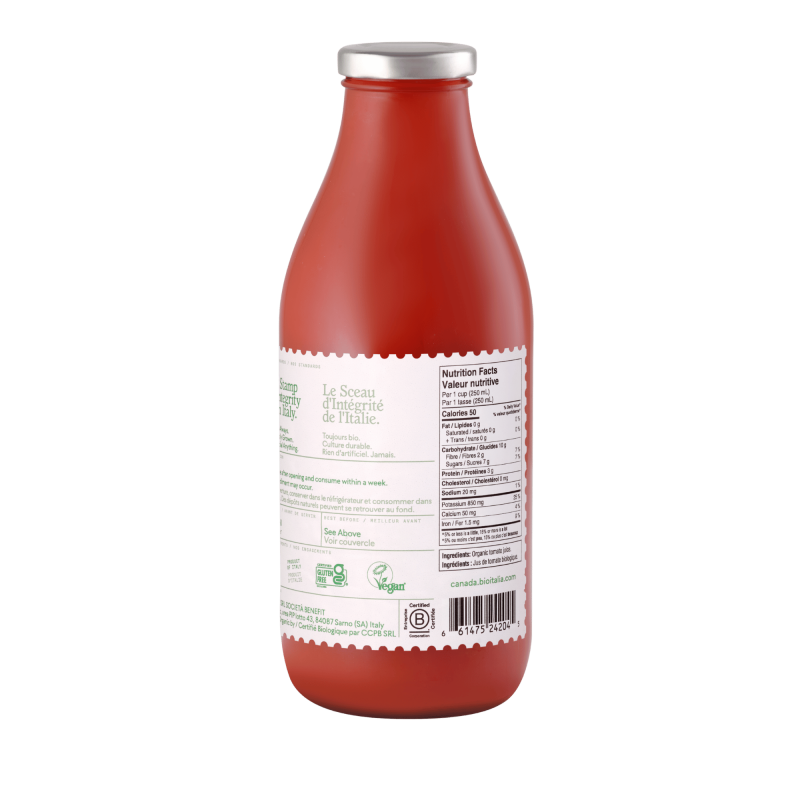 Organic tomato juice is obtained from 100% certified organic tomatoes.