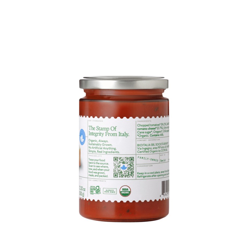 Chopped tomatoes* (96.2%), Basil* (2.1%), Pecorino romano cheese PDO* (0.7%), Extra virgin olive oil*, Salt, Cane sugar*, Oregano*, Chili pepper*, Garlic* (0.01%).
